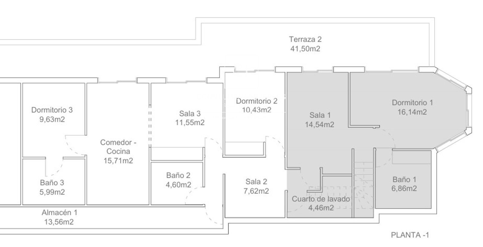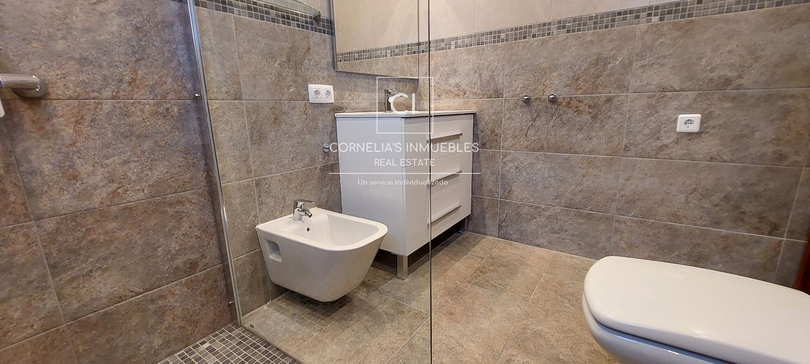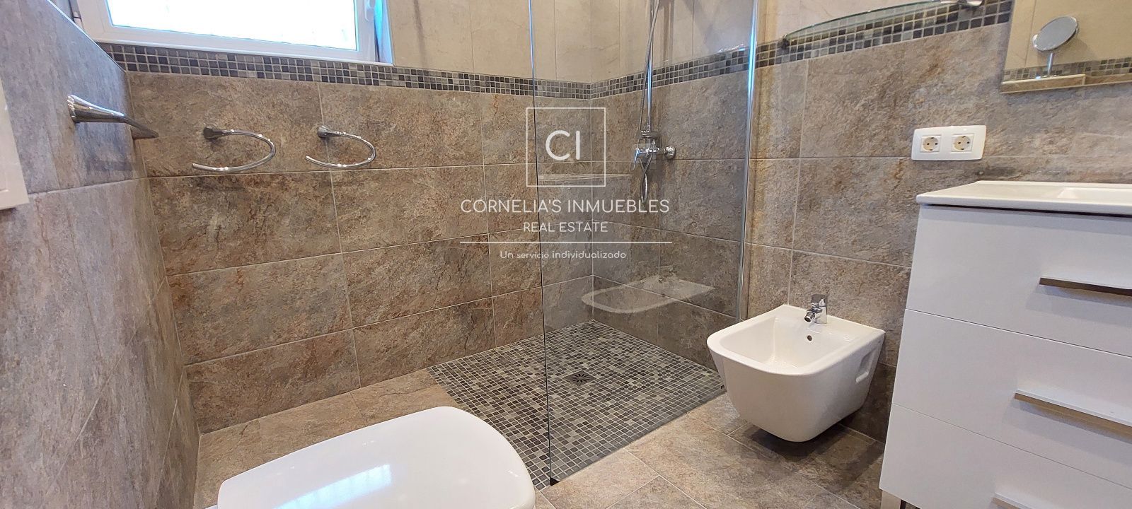 Im Untergeschoss: 5 Schlafzimmer (eins mit Bad en suite), 3 Bäder, mehrere Räume, Waschraum und Abstellraum mit Zugang zu technischen Anlagen. Alle Schlafzimmer führen auf eine große Terrasse (41,5 m²) mit kleinem Garten und Grillplatz.