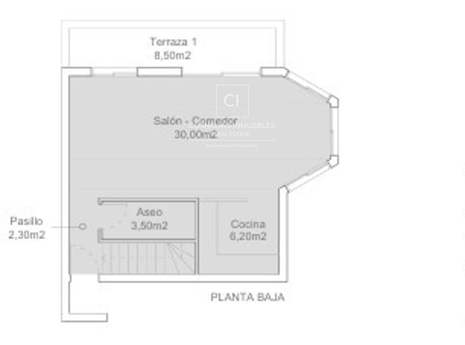 Im Erdgeschoss befinden sich Eingang, Flur, Gäste-WC, großes Wohn-Esszimmer (30 m²), offene Küche (6,2 m²) und Terrasse (8,5 m²).