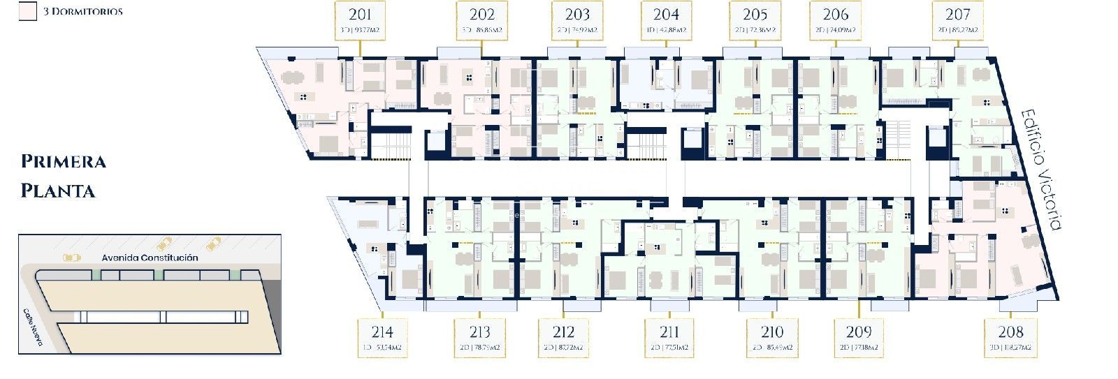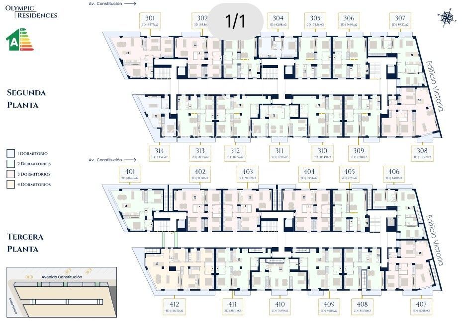 Entdecken Sie Olympic Residences, ein exklusives Neubauprojekt in Adeje, einer der begehrtesten Gegenden Teneriffas. Die Residenz umfasst 55 Wohneinheiten auf vier Etagen in 16 verschiedenen Typen mit 1 bis 4 Schlafzimmern, die allen Bedürfnissen gerecht werden. Die Wohnflächen variieren zwischen 42,88 m² und 136,32 m², die Preise zwischen 249.500 € und 998.500 €. Jede Wohneinheit verfügt über 1 Parkplatz und 1 separaten Abstellraum. Ein Projekt für ruhiges, komfortables und sicheres Wohnen in privilegierter Lage.
