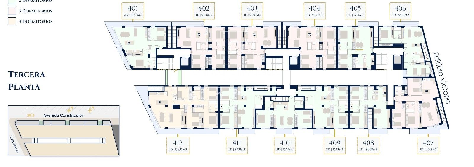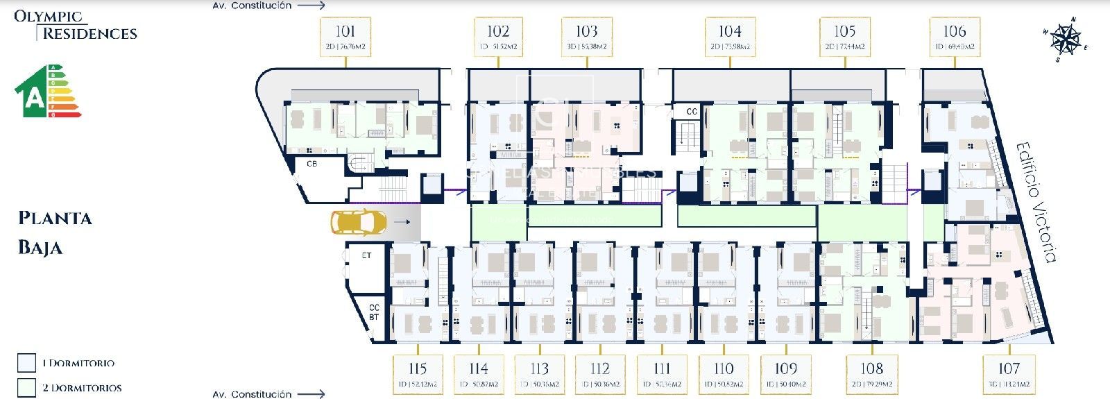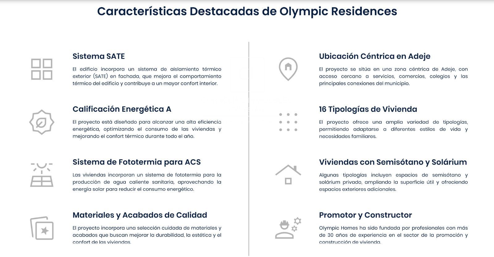 Entdecken Sie Olympic Residences, ein exklusives Neubauprojekt in Adeje, einer der begehrtesten Gegenden im Süden Teneriffas. Der Wohnkomplex umfasst 55 Wohnungen auf vier Etagen mit 16 verschiedenen Wohntypen von 1 bis 4 Schlafzimmern, die allen Bedürfnissen gerecht werden. Die Wohnflächen reichen von 42,88 m² bis 136,32 m², die Preise von 249.500 € bis 998.500 €. Im Preis sind 1 Parkplatz und 1 Abstellraum inbegriffen. Ein Projekt für alle, die Wert auf Qualität, Komfort und eine sichere Investition in privilegierter Lage legen.