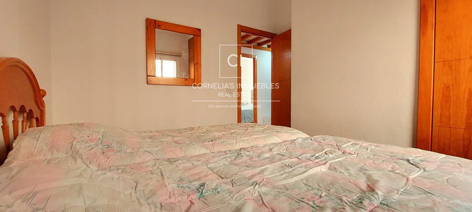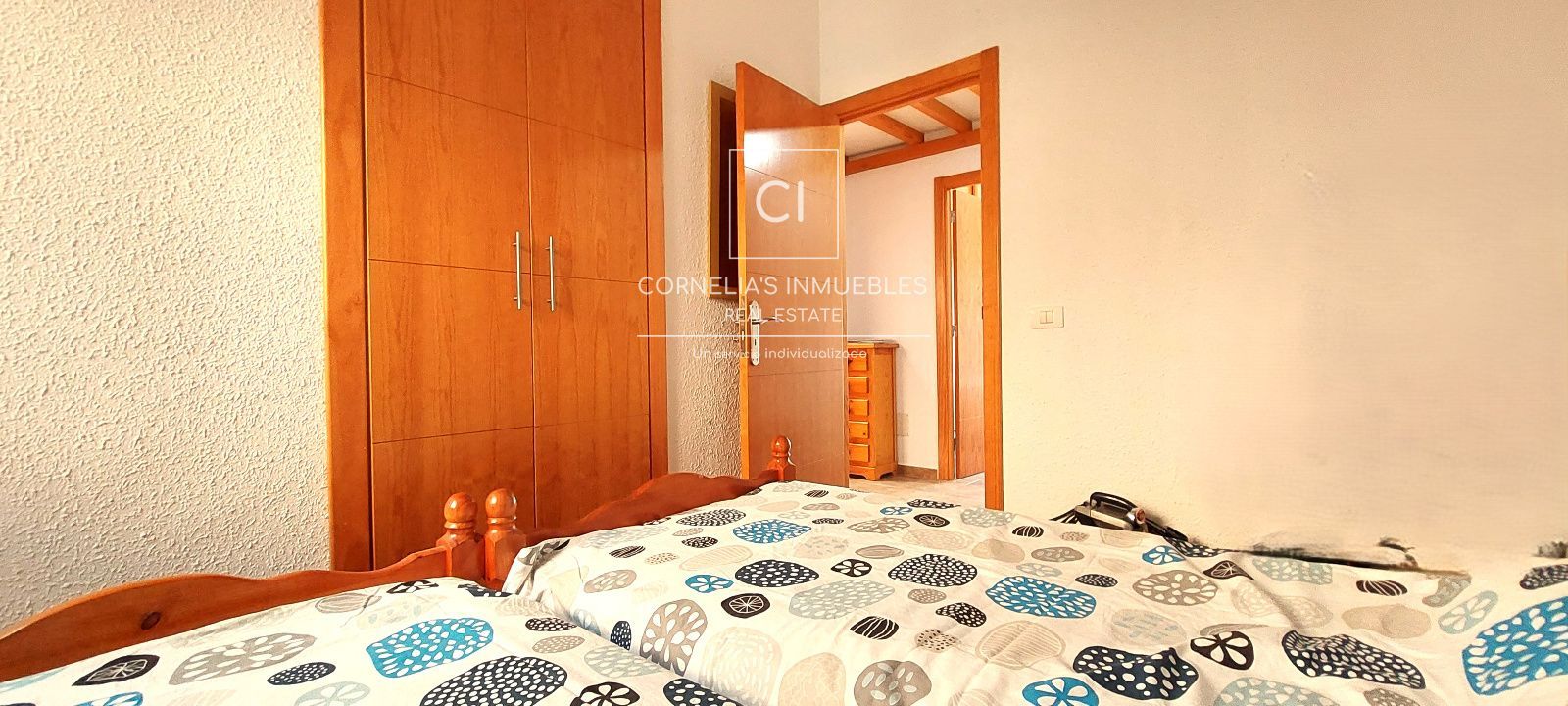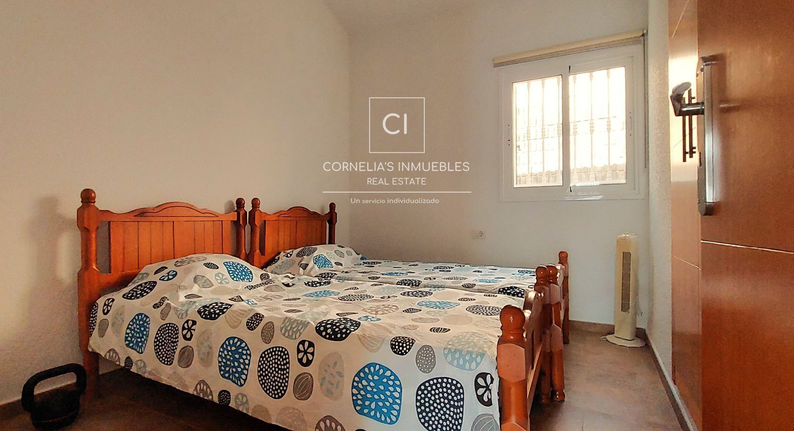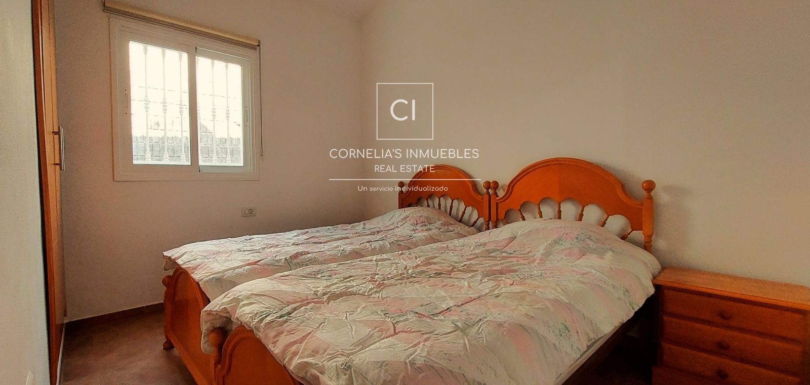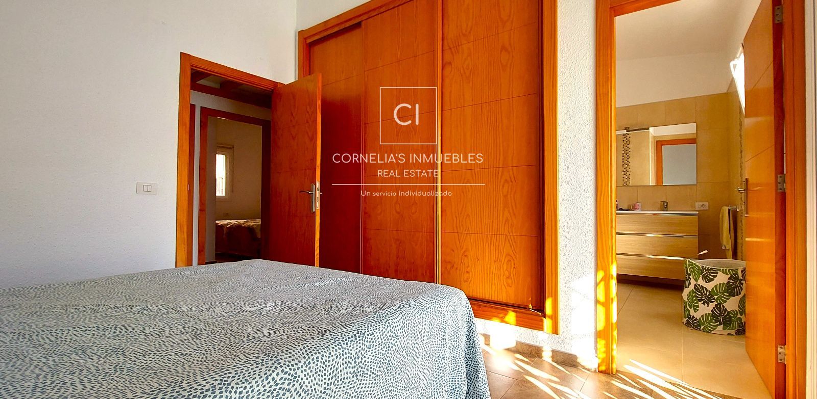 La propriété offre 104 m² de surface habitable et un agencement confortable et fonctionnel. Elle comprend trois chambres, toutes dotées de placards intégrés et de fenêtres assurant une excellente luminosité naturelle. Deux des chambres sont meublées de lits simples, tandis que la chambre principale dispose d'un lit double, d'une salle de bains privative et d'un accès direct à la terrasse. Une deuxième salle de bains complète dessert les trois autres chambres.
